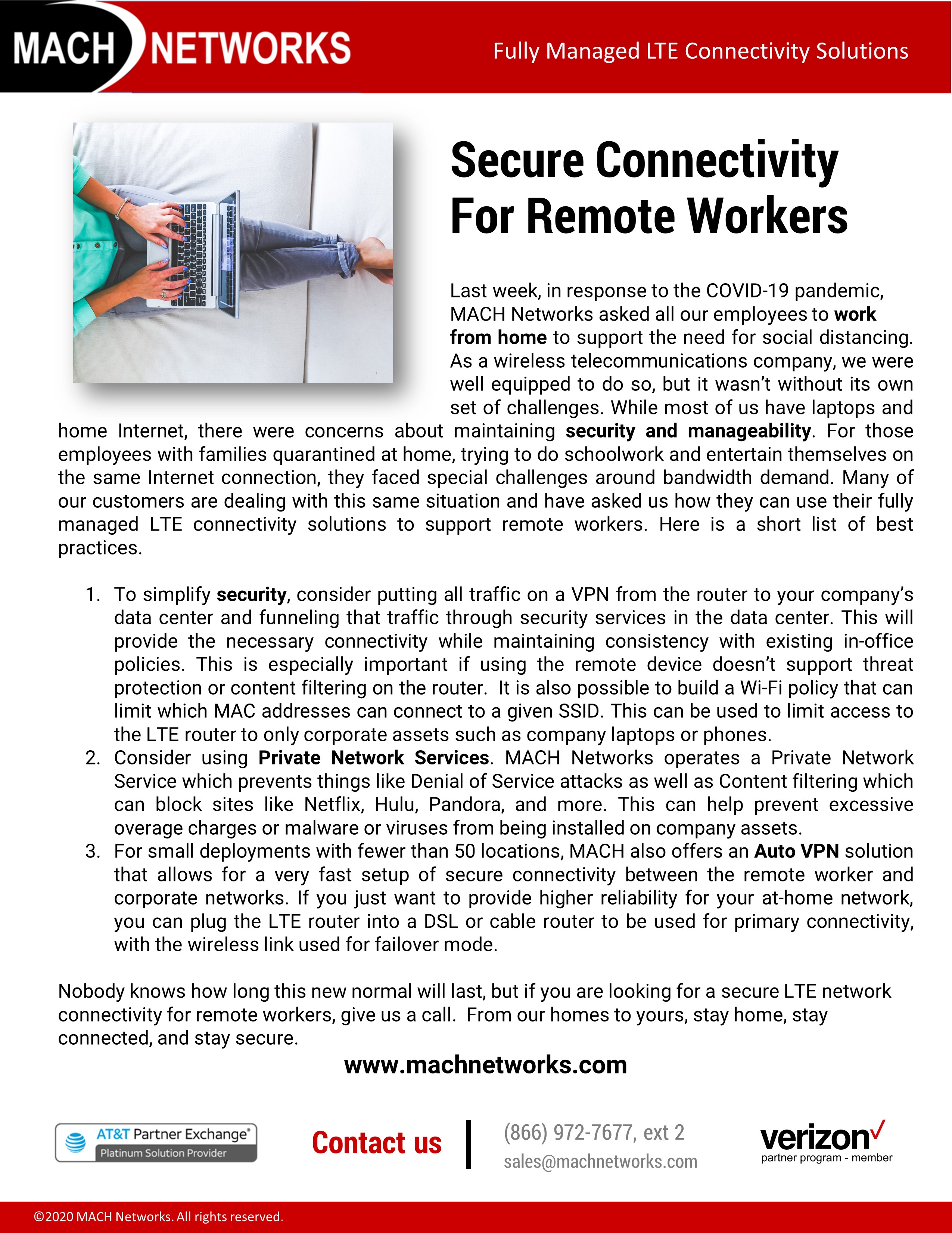 Last week, in response to the COVID-19 pandemic, MACH Networks asked all our employees to work from home to support the need for social distancing. As a wireless telecommunications company, we were well equipped to do so, but it wasn’t without its own set of challenges. While most of us have laptops and home Internet, there were concerns about maintaining security and manageability. For those employees with families quarantined at home, trying to do schoolwork and entertain themselves on the same Internet connection, they faced special challenges around bandwidth demand. Many of our customers are dealing with this same situation and have asked us how they can use their fully managed LTE connectivity solutions to support remote workers. Here is a short list of best practices.